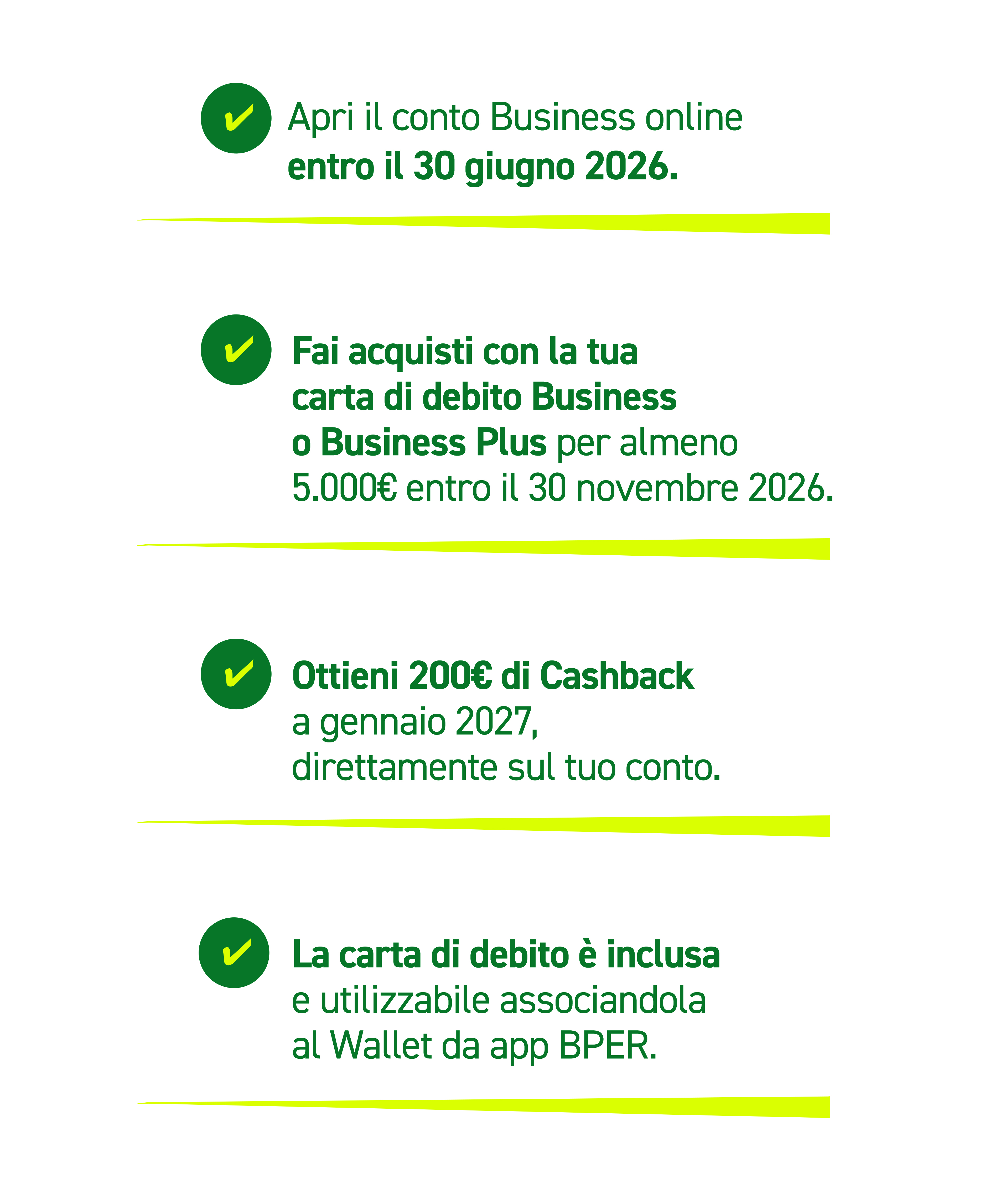 Promozione Cashback: offerta valida dal 09/04/2026 al 30/06/2026 solo per i nuovi clienti Business che aprono il conto online entro il 30/06/2026 ed effettuano pagamenti per un importo complessivo pari o superiore a 5.000€ con la carta di debito Business o carta di debito Business Plus entro il 30/11/2026. Sono esclusi dalla Promozione Cashback tutti i clienti che dall’apertura conto online al 30/11/2026 accedono ad altre promozione che azzerano il canone del conto. Regolamento disponibile su bancosardegna.it