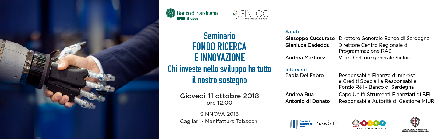 In data 11 ottobre 2018 si terrà a Cagliari presso la Manifattura Tabacchi, in occasione delle iniziative legate a SINNOVA 2018, un convegno per la presentazione del Fondo Ricerca & Innovazione, di cui il Banco di Sardegna è soggetto gestore insieme a Sinloc S.p.A..