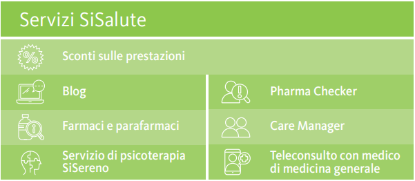 Proteggere la tua salute non è mai stato così semplice: grazie a SiSalute, hai a disposizione tanti servizi utili, in tempi rapidi e senza preoccupazioni. Ad esempio, prenoti visite specialistiche, prestazioni di diagnostica e fisioterapia a tariffe agevolate. Inoltre puoi usufruire di assistenza domiciliare a tariffe di favore e del servizio di televisita gratuito disponibile 24h/24h.