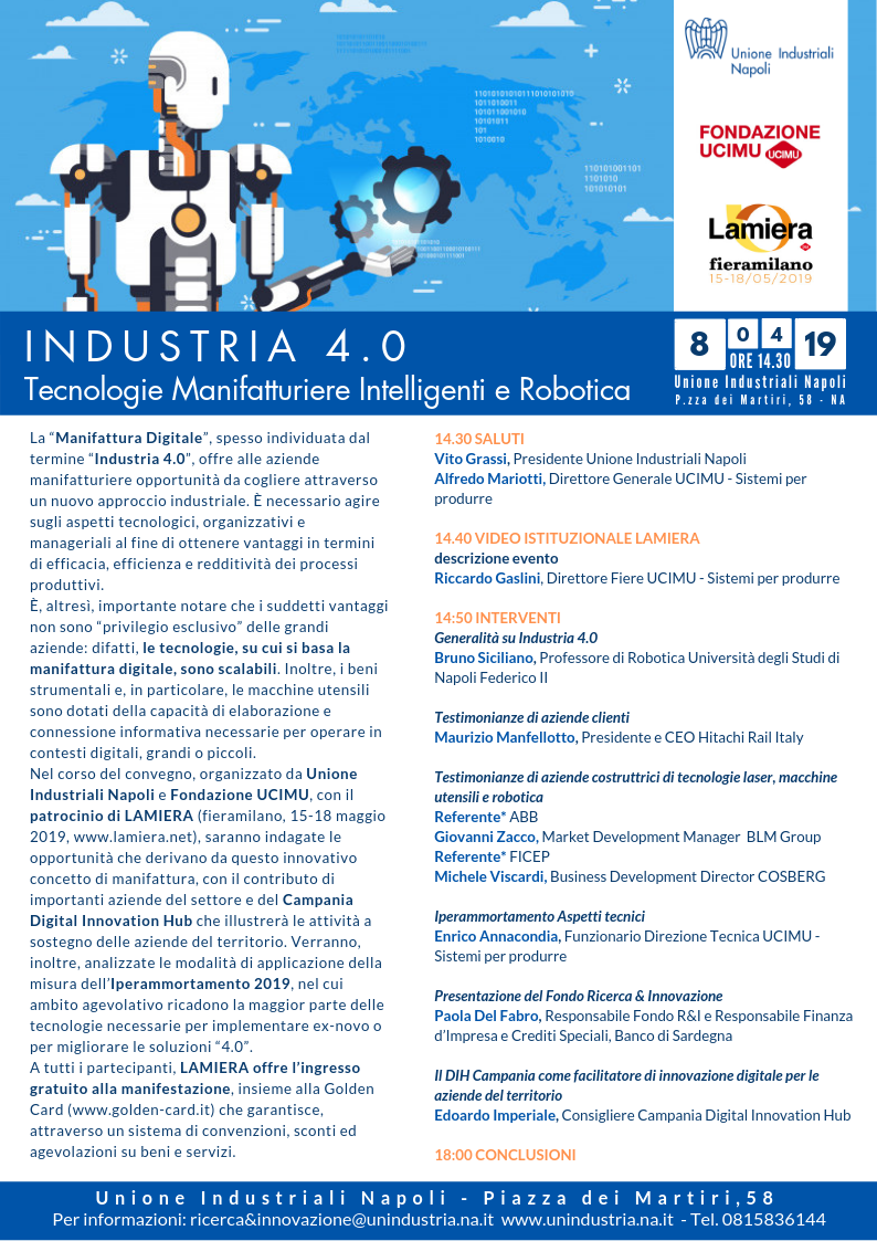 L’Unione Industriali Napoli e la Fondazione UCIMU, con il patrocinio di LAMIERA, organizzano a Napoli presso la sede degli Industriali, in data 8 aprile alle ore 14:30, un evento dal titolo “INDUSTRIA 4.0 – Tecnologie Manifatturiere Intelligenti e Robotica”. Il Banco di Sardegna è stato inviato a partecipare quale relatore per la presentazione del Fondo Ricerca & Innovazione, del quale è istituto gestore.